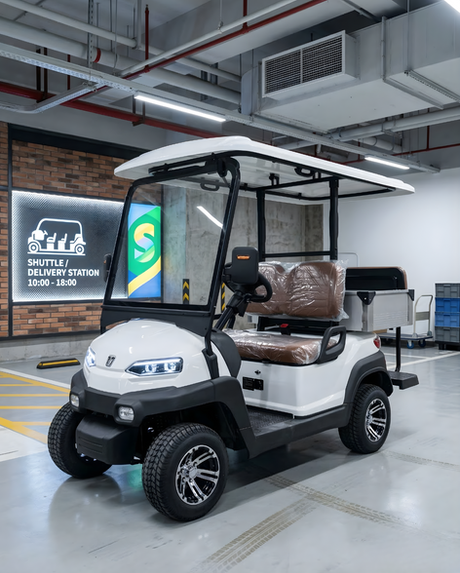 The GAZMIN Eco-Luxury 2-Seater + Cargo Box Golf Cart combines compact mobility with practical utility. Powered by a 4KW AC motor and 48V maintenance-free battery system, it delivers smooth performance, reliable torque, and an impressive 80–100 km range on a single charge. Designed for both comfort and functionality, it features a modern dashboard with a 9-inch waterproof screen, reverse camera, Bluetooth, and USB charging ports, along with LED lighting, safety belts, and a durable rubber floor mat. The independent front suspension and hydraulic shock absorbers ensure a stable and comfortable ride across various terrains.